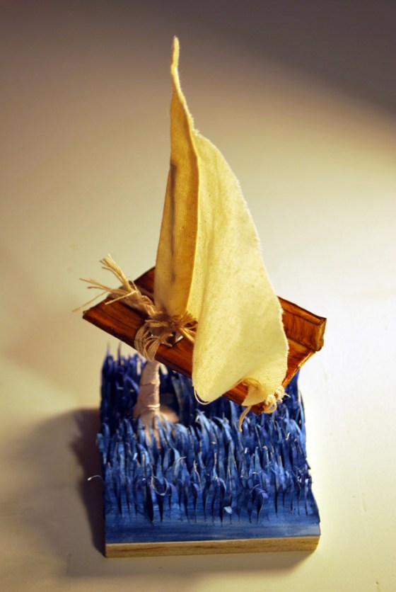 4″ x 4″ x 9″ Paper, Watercolor, Oil, Found fabric and yarn on panel.